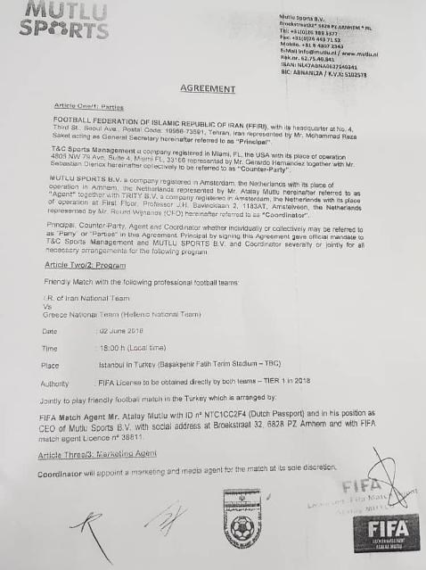 همچنین ذکر این نکته ضروری است از آنجا که در برخی منابع اعلام شده که برای برگزاری دیدار ایران و یونان قرارداد محکمی میان طرفین در کار نبوده، بر این اساس قراردادهای مرتبط با برگزاری دیدار ایران و یونان برای تنویر افکار عمومی در سایت رسمی فدراسیون فوتبال منتشر میشود.