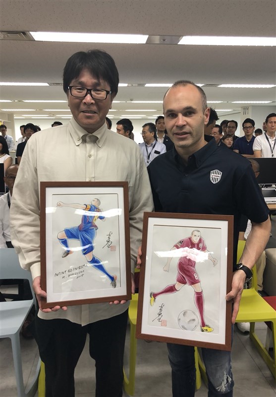 از جمله افرادی که از ورود ستاره سابق بارسلونا به ژاپن هیجان زده و خوشحال شده، یوئیچی تاکاهاشی خالق انیمیشن محبوب «فوتبالیست‌ها» است که با اهدای دو تابلوی کاریکاتور از اینیستا با پیراهن تیم‌ قدیم و تیم جدیدش، به او خوشامدگویی کرد.