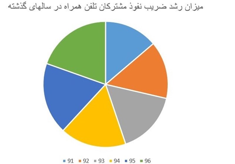 روند رشد این شاخص در سالهای 95، 94، 93 و 92 به ترتیب 7.68، 5.16، 8.02 و 5.43 درصد بوده و همانطور که مشخص است در پنج سال گذشته بیشترین رشد ضریب نفوذ مشترکان فعال تلفن همراه طی یک سال، در سال 93 اتفاق افتاده است.
