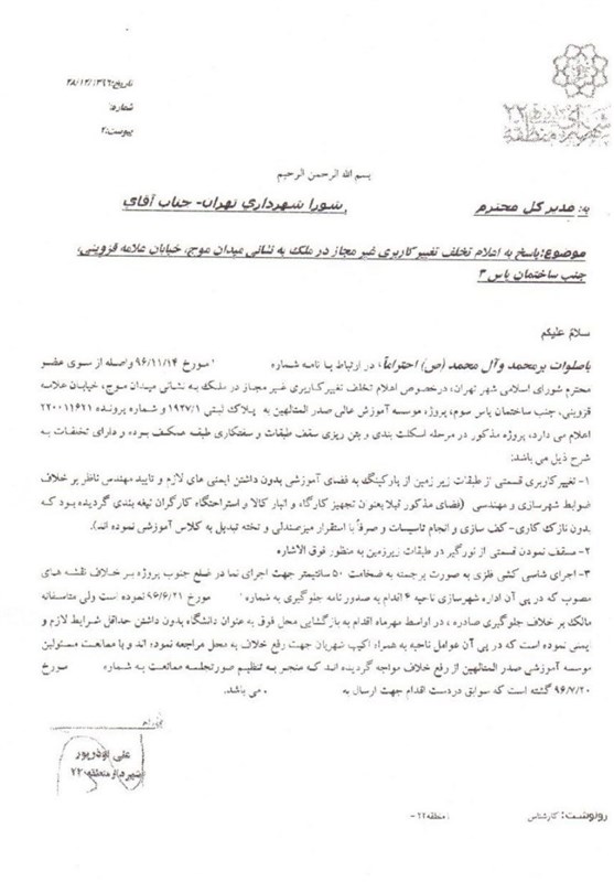 نامه هاشمی به شهردار منطقه 22 برای بررسی موضوع