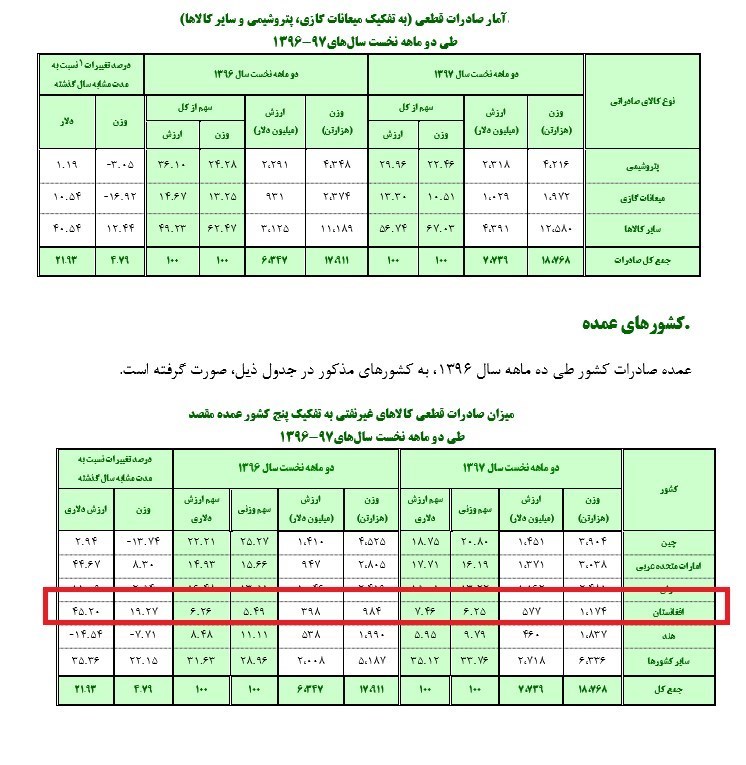 میزان صادرات به عراق در دو ماهه ابتدایی سال حدود 1.1 میلیارد دلار و میزان صادرات به افغانستان نزدیک به 577میلیون دلار بوده است. به این ترتیب 22 درصد صادرات غیر نفتی  ایران به این دو کشور بوده است.