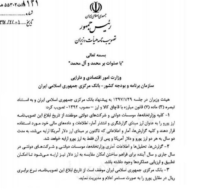 گفتنی است؛ هیئت وزیران در جلسه 29 فروردین ماه بهپیشنهاد بانک مرکزی و بهاستناد تبصره 3ماده 7 قانون مبارزه با قاچاق کالا و ارز مصوب کرد، کلیه وزارتخانهها، شرکتها و مؤسسات دولتی موظفاند از تاریخ ابلاغ این مصوبه از یورو بهجای دلار بهعنوان ارز مبنای گزارشگری و انتشار آمار و اطلاعات و دادههای مالی خود استفاده کنند، بر این اساس بهمدت دو سال گزارشات آماری به هر دو ارز دلار و یورو و پس از آن تنها بر اساس ارز یورو ارائه خواهد شد.