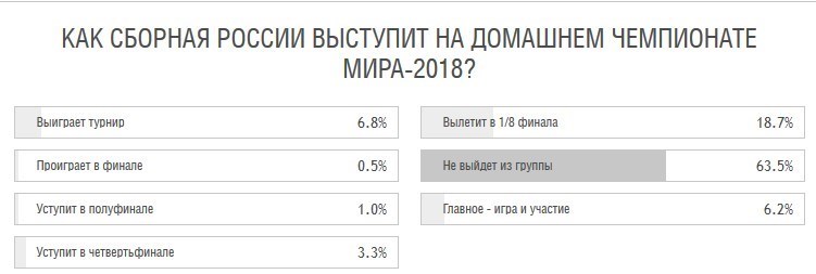 به گزارش خبرگزاری تسنیم، روزنامه اسپورت اکسپرس روسیه در فاصله 10 روز تا آغاز جهانی 2018 فوتبال به میزبانی این کشور نظرسنجی شش گزینهای درباره تیم ملی روسیه انجام داد که نتایج آن به شرح زیر است: