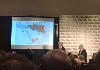 نخست‌وزیر رژیم صهیونیستی در ادامه سخنان خود در محل اندیشیکده «پالیسی اکسچنج» پاپورپوینتی را به حضار نشان داد که به زعم وی نشان دهنده این است که ایران چگونه «خواهان فتح» کشورهای عرب سنی است.