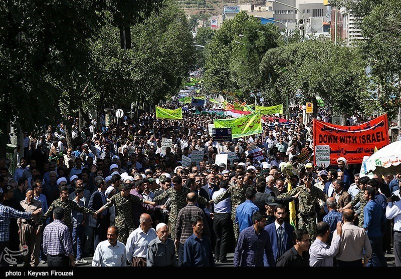 در مراسم باشکوه راهپیمایی روز جهانی قدس، مردم همیشه در صحنه کردستان اعم از پیر و جوان، زن و مرد، شیعه و سنی، دانشآموزان و دانشجویان، روحانی و بازاری، نیروهای نظامی و انتظامی، فرهنگیان، خانواده معظم شهدا و ایثارگران، کارمندان، کارگران و اقشار مختلف مردم با حضور گسترده بار دیگر به صحنه آمدند و با شعارها و فریادهای استکبارستیز خود همانند مرگ بر آمریکا، مرگ بر اسرائیل،«ما همه سرباز توییم خامنهای گوش به فرمان توییم خامنهای» با آرمانهای امام راحل(ره) و رهبر فرزانه انقلاب تجدید بیعت کردند و "وحدت، اتحاد، انسجام، همبستگی" مسلمانان شیعه و سنی در کردستان را به رخ استکبار و یاوهگویان کشاندند.