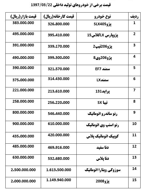 قیمت تعدادی از خودروهای داخلی در بازار امروز به شرح زیر است: