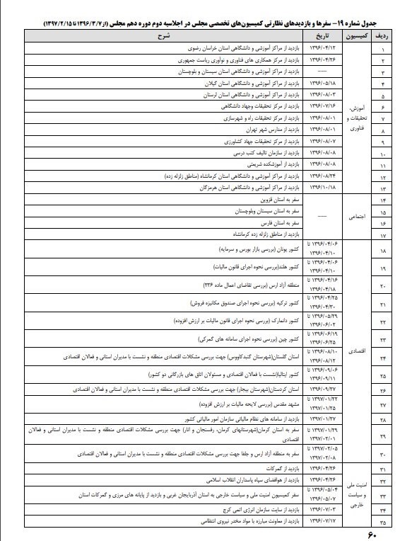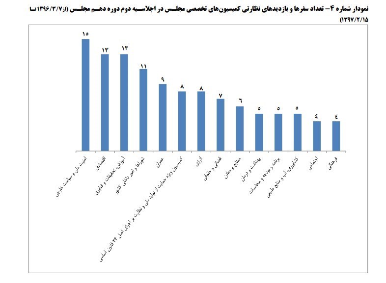 براساس اطلاعات اخذ شده از کمیسیونهای تخصصی مجلس مندرج در جدول شمار 19 و نمودار شمار 4 پیوست، در مجموع 113 سفر و بازدید برای نظارت بر اجرای قوانین و پیگیری نزدیک امور صورت پذیرفته است.
