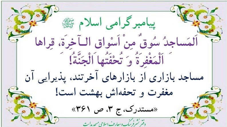 به عنوان نمونه پیامبر گرامی اسلام(ص) در یک روایت در اهمیت مسجد فرمودند: «المَساجِد سوقٌ مِن أسواقُ الآخِرة؛ قِراهَا المَغفرة و تُحفَتُها الجَنةُ؛ مساجد بازاری از بازارهای آخرتند؛ پذیرایی آن مغفرت و تحفهاش بهشت است»