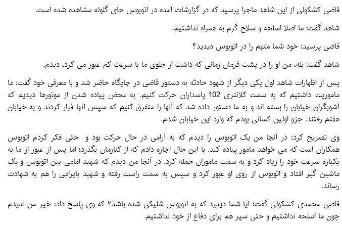 این ادعا در حالی مطرح میشود که در سومین جلسه دادگاه، شاهد عینی حادثه که یکی از مأموران نیروی انتظامی است در پاسخ به سؤال قاضی کشکولی مبنی بر اینکه «خود شما متهم را در اتوبوس دیدید؟» گفته است: بله، من او را در پشت فرمان زمانی که داشت از جلوی ما با سرعت کم عبور میکرد، دیدم. (لینک خبر در خبرگزاری ایسنا)