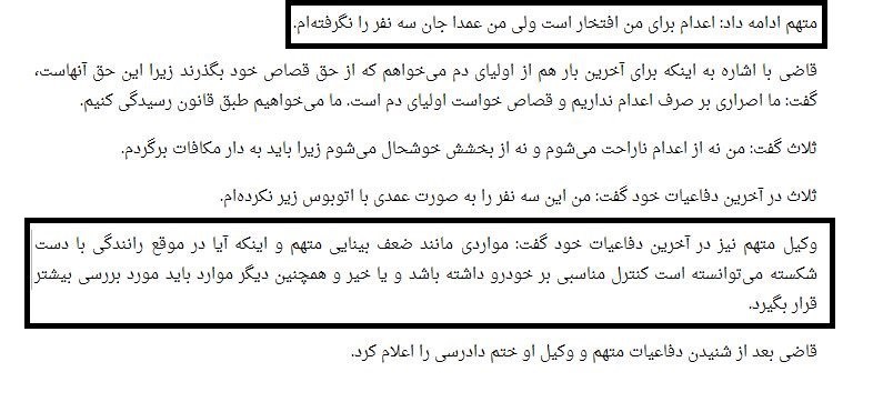 متهم پرونده در پاسخ به این سؤال که «آیا قبول دارید در حین رانندگی 3 نفر را بهقتل رساندهاید؟»، گفت: بله، قبول دارم.