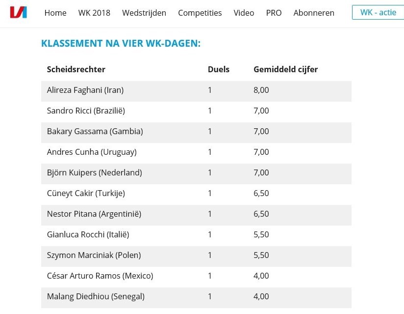 همچنین در جدول ردهبندی داوران حاضر در جام جهانی 2018 از نگاه این سایت هلندی، علیرضا فغانی از ایران با کسب 8 امتیاز در صدر قرار دارد و ساندرو ریکی از برزیل و باکاری گاساما از گامبیا نیز به هر یک با کسب یک امتیاز پشتسر وی هستند.