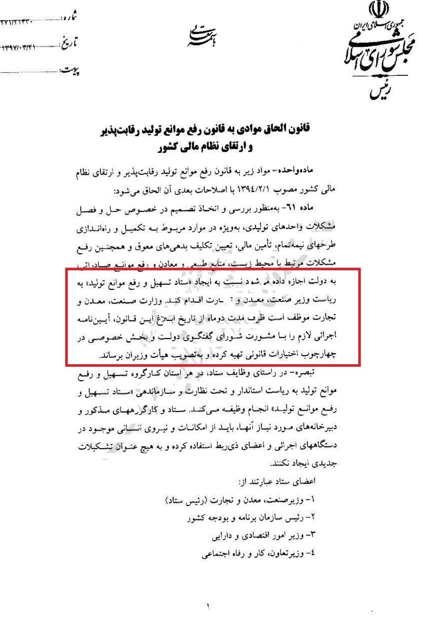 به گزارش خبرنگار اقتصادی خبرگزاری تسنیم، بر اساس ماده واحده قانون رفع موانع تولید رقابت پذیر و ارتقای نظام مالی کشور، دولت مجاز به تشکیل ستاد تسهیل و رفع موانع تولید به ریاست وزیر صنعت شد. این وزارت خانه نیز مکلف شد طی دو ماه آینده آیین نامه اجرایی لازم را با مشورت شورای گفتگوی دولت و بخش خصوصی به تصویب هیئت وزیران برساند.