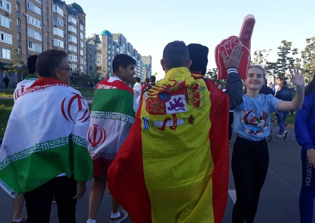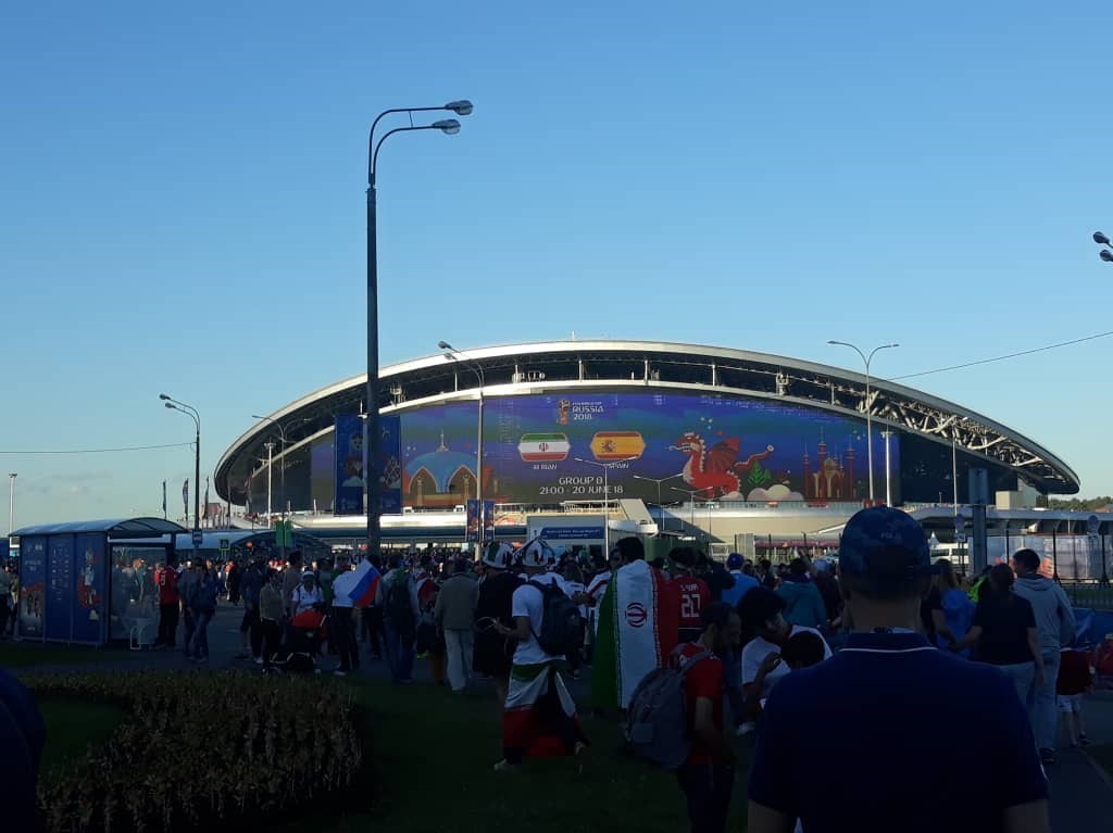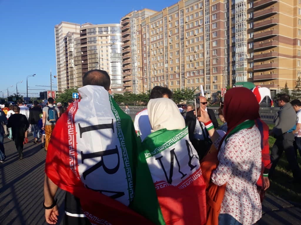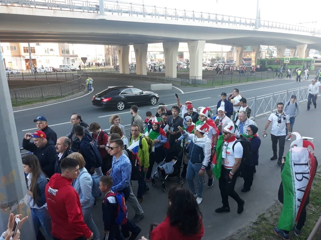 * هواداران پرشور ایرانی در حال حرکت به سمت ورزشگاه کازان هستند و در بیرون ورزشگاه شعار میدهند. این در حالی است که تماشاگران اسپانیایی با آرامش و بدون سر دادن شعار، به سمت ورزشگاه میآیند.