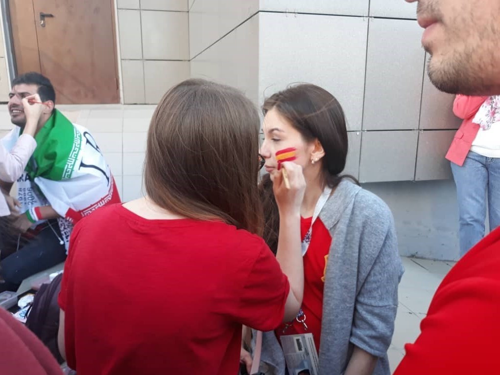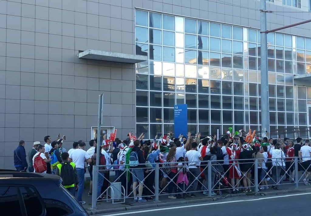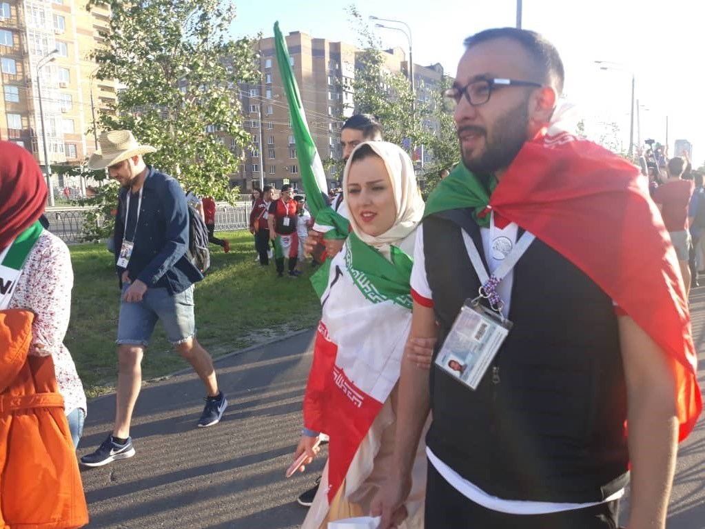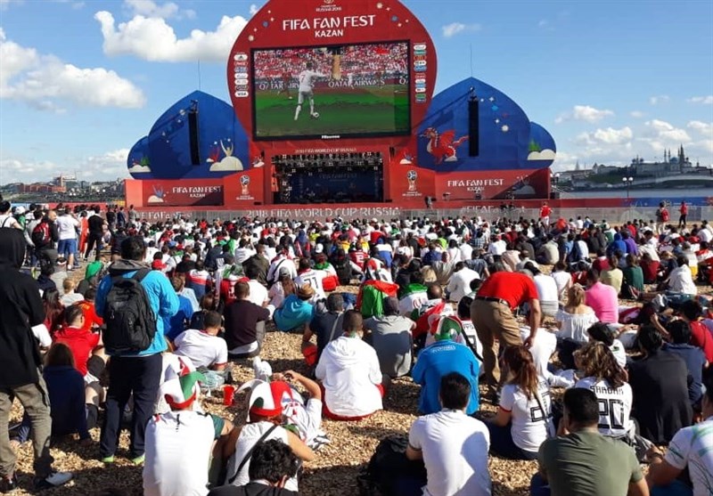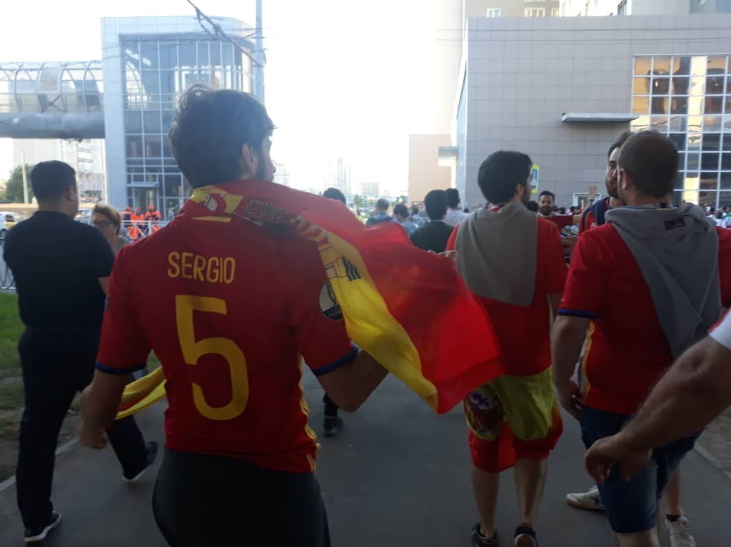 * هواداران پرشور ایرانی در حال حرکت به سمت ورزشگاه کازان هستند و در بیرون ورزشگاه شعار میدهند. این در حالی است که تماشاگران اسپانیایی با آرامش و بدون سر دادن شعار، به سمت ورزشگاه میآیند.