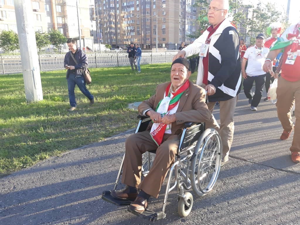 *پیرمردی که از اصفهان به روسیه آمده، خود را با ویلچر به ورزشگاه رسانده است.
