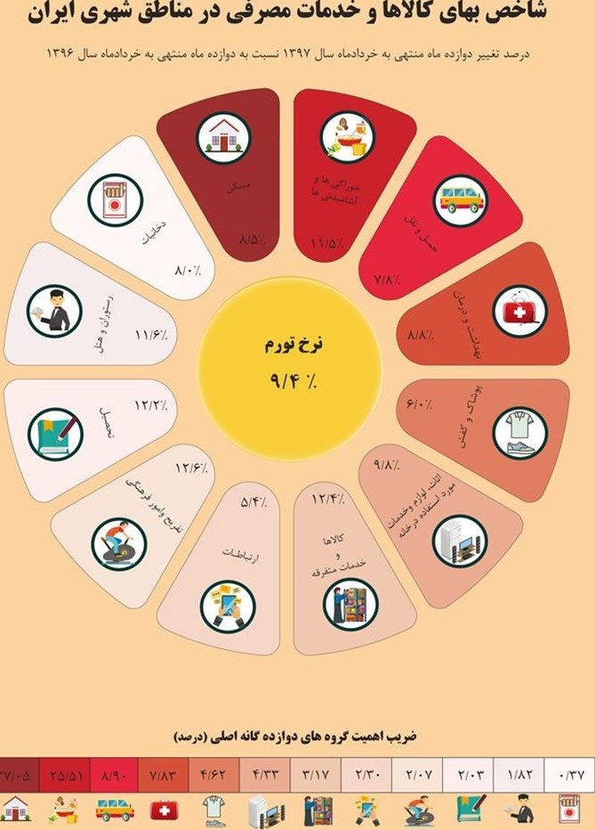 - شاخص بهای کالاها و خدمات مصرفی در مناطق شهری ایران در خردادماه 1397 به عدد 122.6 رسید که نسبت به ماه قبل 4.3 درصد افزایش یافت.