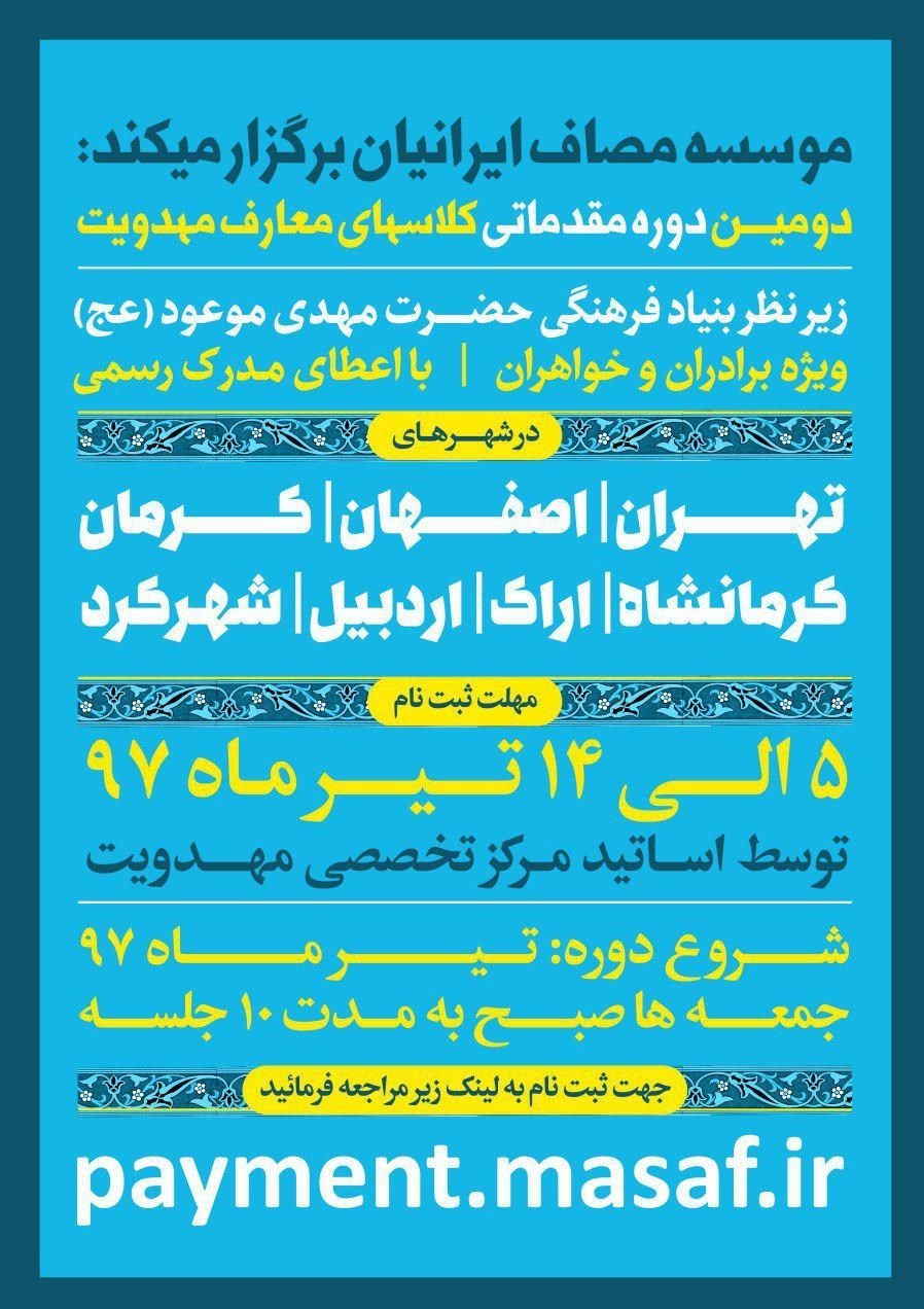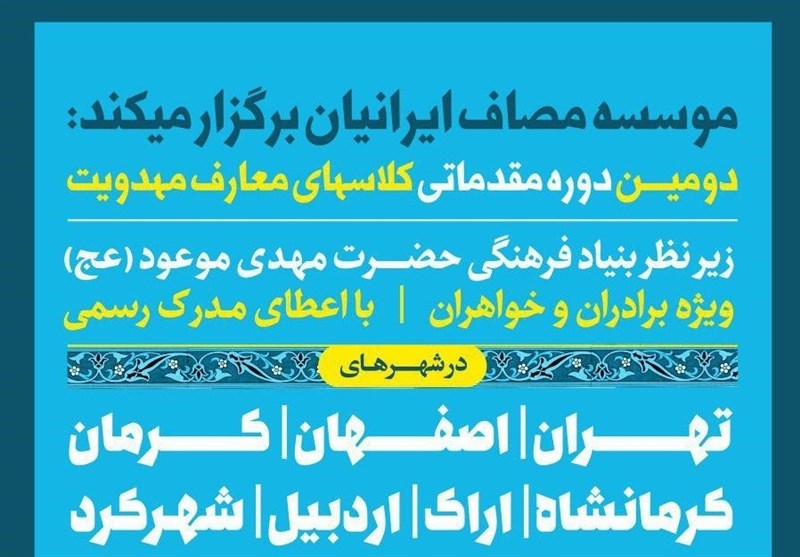 دومین دوره کلاس‌های مقدماتی معارف مهدویت در 7 شهر با همکاری بنیاد حضرت مهدی موعود برگزار می‌شود.