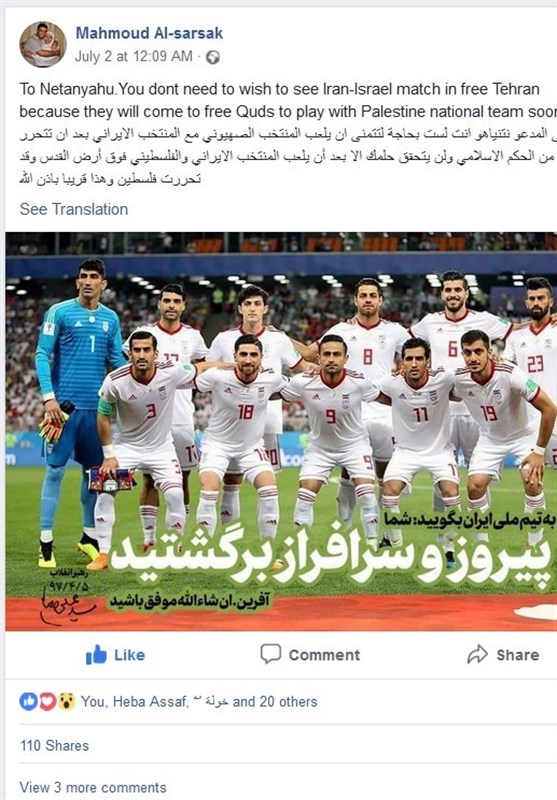 به گزارش گروه بین الملل خبرگزاری تسنیم، محمود سرسک، بازیکن سابق تیم ملی فلسطین  در صفحه فیسبوکش با قرار دادن عکسی از تیم ملی ایران که ذیل آن پیام مقام معظم رهبری به تیم ملی نیز درج شده بود در پیامی خطاب به نتانیاهو، نخست وزیر رژیم صهیونیستی نوشت: لازم نیست امیدوار باشی که مسابقه ایران-اسرائیل را در تهران آزاد ببینی زیرا آنها به قدس آزاد خواهند آمد تا با تیم ملی فلسطین مسابقه دهند.