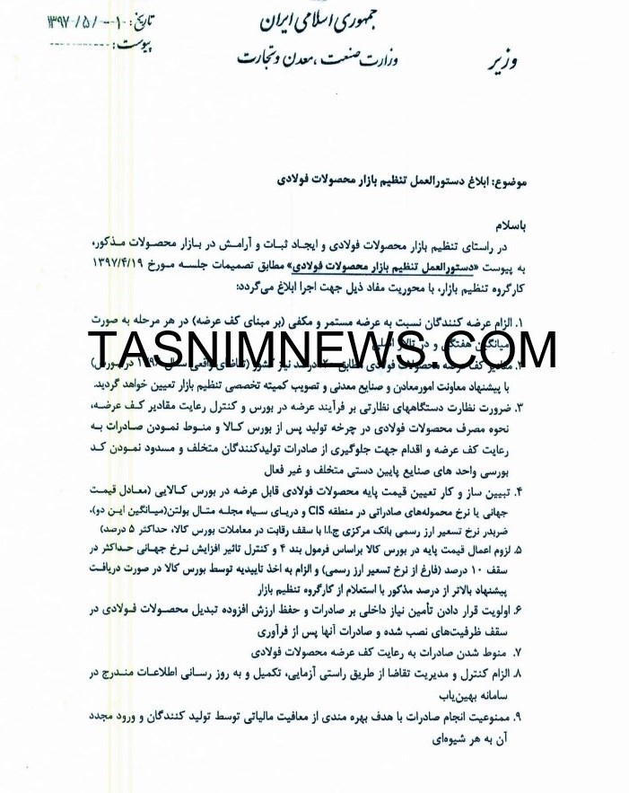 به گزارش خبرنگار اقتصادی خبرگزاری تسنیم، محمد شریعتمداری وزیر صنعت، معدن و تجارت دستور العمل جدید تنظیم بازار محصولات فولادی را ابلاغ کرد که در این ابلاغیه آمده است: در راستای تنظیم بازار محصولات فولادی و ایجاد ثبات و آرامش در بازار محصولات مذکور، به پیوست «دستورالعمل تظنیم بازار محصولات فولادی» مطابق تصمیمات جلسه مورخ 19 تیر ماه 1397 کارگروه تنظیم بازار، با محوریت مفاد ذیل جهت اجرا ابلاغ میگردد: