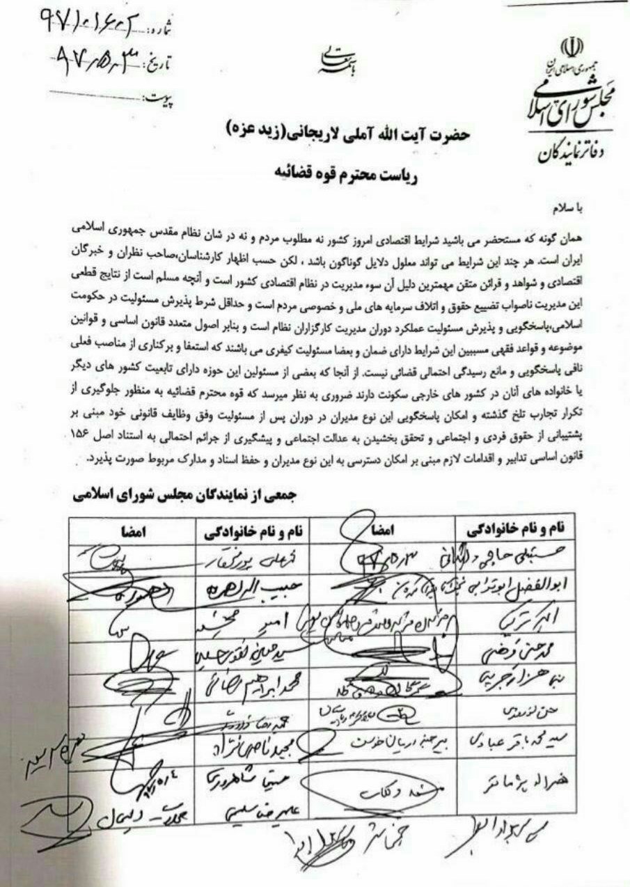 همانگونه که مستحضر میباشید شرایط اقتصادی کشور نه مطلوب مردم و نه در شأن نظام مقدس جمهوری اسلامی ایران است. هر چند این شرایط میتواند معلول دلایل گوناگون باشد، لکن حسب اظهار کارشناسان صاحبنظران و خبرنگاران اقتصادی و شواهد و قرائن متقن مهمترین دلیل آن سوءمدیریت در نظام اقتصادی کشور است و آنچه مسلم است از نتایج قطعی این مدیریت ناصواب تضییع حقوق و اتلاف سرمایههای ملی و خصوصی مردم است و حداقل شرط پذیرش مسئولیت در حکومت اسلامی پاسخگویی و پذیرش مسئولیت عملکرد دوران مدیریت کارگزاران نظام است و بنابر اصول متعدد قانون اساسی و قوانین موضوعه و قواعد فقهی مسببین این شرایط دارای ضمان و بعضا مسئولیت کیفری میباشند که استعفا و برکناری از مناصب فعلی نافی پاسخگویی و مانع رسیدگی احتمالی قضائی نیست.