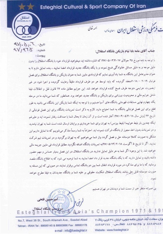 وی در اینباره گفت: رسما به تیام نامه زدیم تا به این بازیکن اعلام کنیم که با توجه به قرارداد او با استقلال به دنبال بازگرداندن او به تیم هستیم و این بازیکن باید براساس قراردادی که با استقلال دارد در تمرینات حاضر شود.