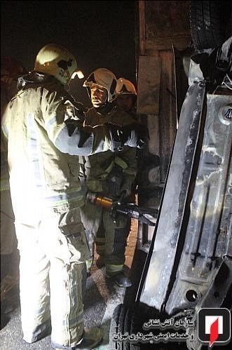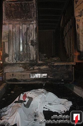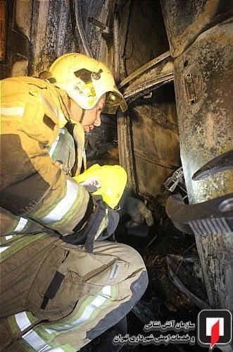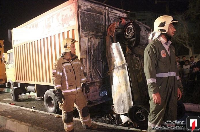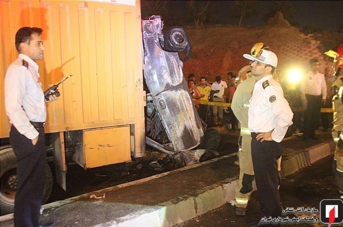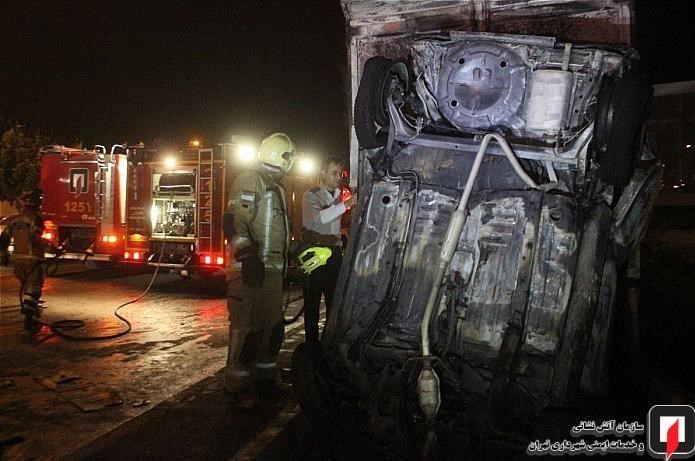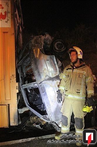 وی افزود: خودروی سواری پس از واژگونی به حالت سر و ته بر روی زمین و قسمت اتاق بارعقب کامیون قرار گرفت و سپس طعمه آتشسوزی شد.