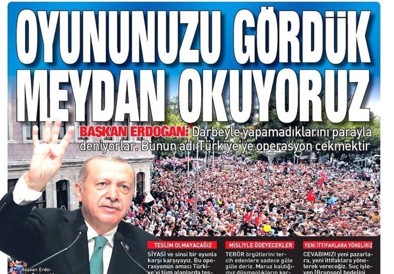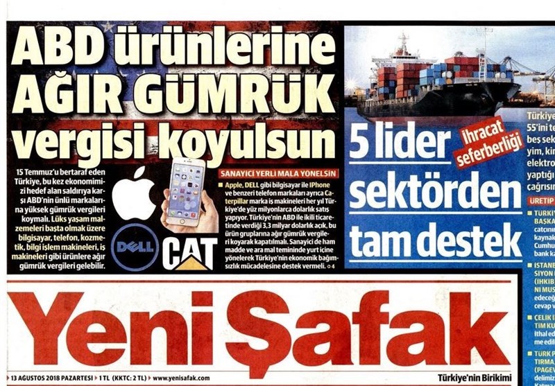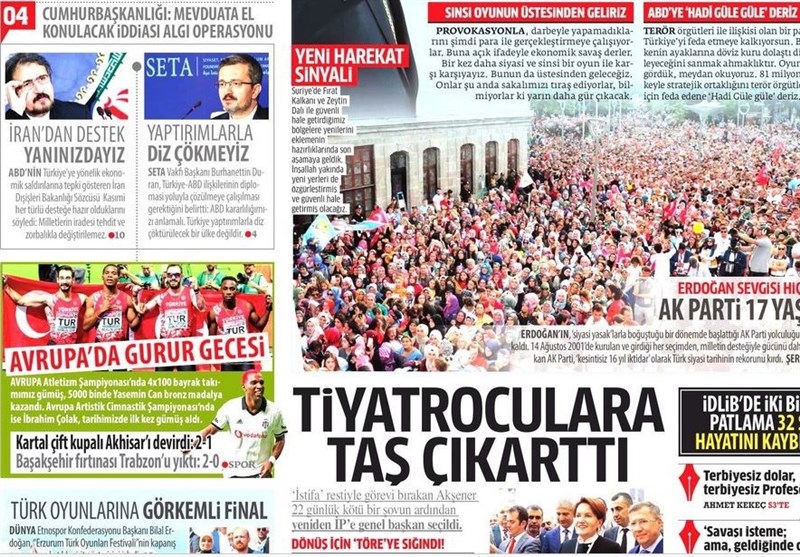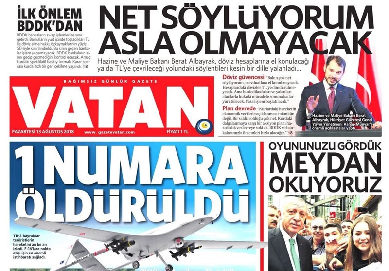 به گزارش گروه بینالملل خبرگزاری تسنیم، بسیاری از روزنامههای ترکیه، امروز در عکس و تیتر صفحه نخست، مواضع تند اردوغان در قبال تهدیدات آمریکا را برجسته کردهاند. همچنین این روزنامهها موضوعات دیگری مانند کشته شدن یکی از فرماندهان مهم پ.ک.ک با هواپیمای بدون سرنشین و مشکلات مربوط به تنش داخلی حزب جمهوری خلق و حزب خوب را مورد توجه قرار دادهاند.