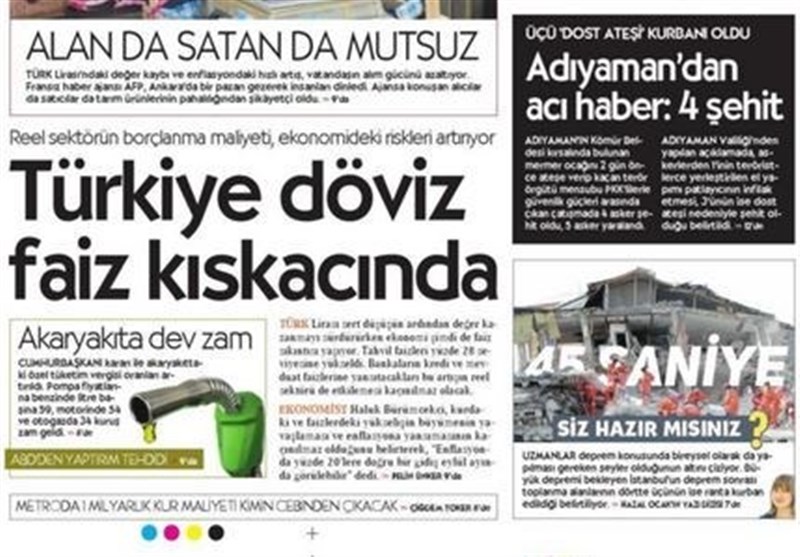 به گزارش گروه بین­‌الملل خبرگزاری تسنیم، بسیاری از روزنامه­‌های ترکیه، امروز در عکس و تیتر صفحه­ نخست، اظهارات اردوغان در مورد گذار ترکیه از بحران ارزی را برجسته کرده‌اند. همچنین این روزنامه­‌ها موضوعات دیگری مانند تصمیمات وزیر دارایی برای حل بحران اقتصادی و جزئیات عملیات هوایی کشتن یکی از سران پ.ک.ک در سنجار عراق را مورد توجه قرار داده‌اند.