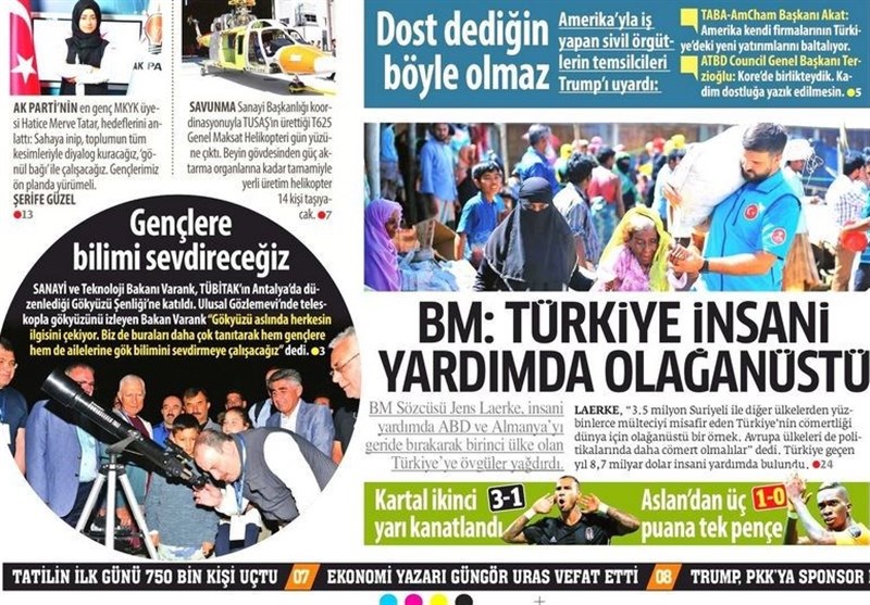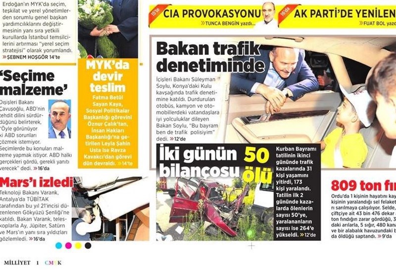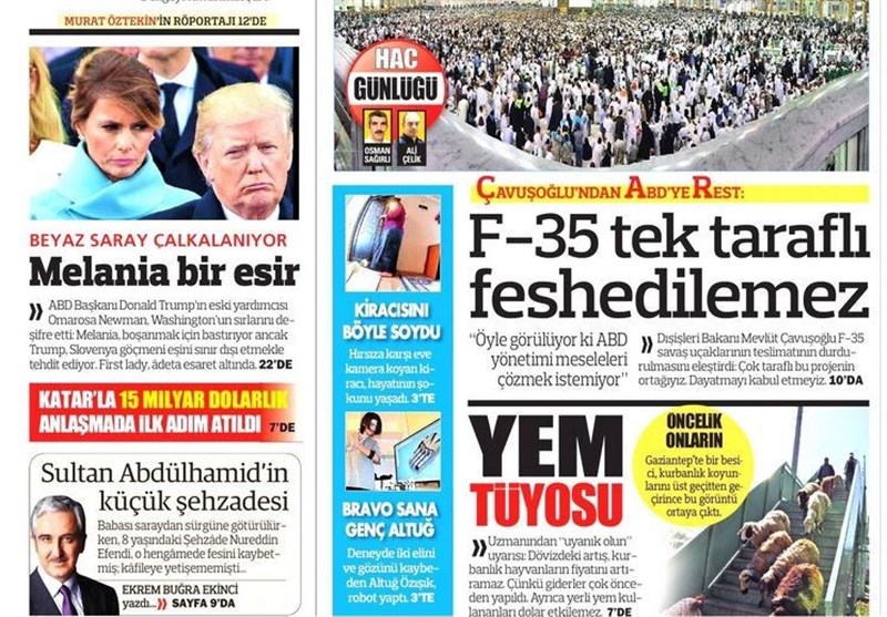 به گزارش گروه بینالملل خبرگزاری تسنیم، بسیاری از روزنامههای ترکیه، امروز در عکس و تیتر صفحه نخست، تغییر و تحول در حزب عدالت و توسعه را برجسته کردهاند. همچنین این روزنامهها موضوعات دیگری مانند تنش سیاسی و اقتصادی با آمریکا، ساخت بالگرد ملی و تعطیلات عید قربان را مورد توجه قرار دادهاند.