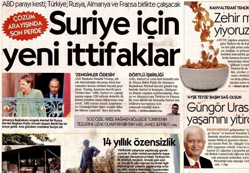 - آمریکا، ارسال پول را متوقف کرد، ترکیه، روسیه، فرانسه و آلمان در سوریه، متحد شدند