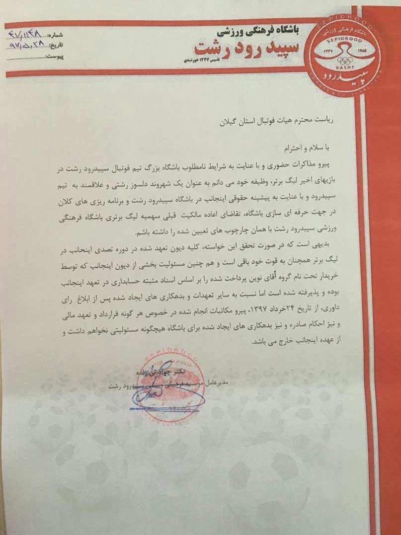 در همین راستا، جواد تنزاده مالک پیشین سپیدرود با ارسال نامهای به هیئت فوتبال استان گیلان خواستار باز گرداندن مالکیت باشگاه به خودش شده است. متن نامه تنزاده به هیئت فوتبال گیلان را در زیر مشاهده میکنید.