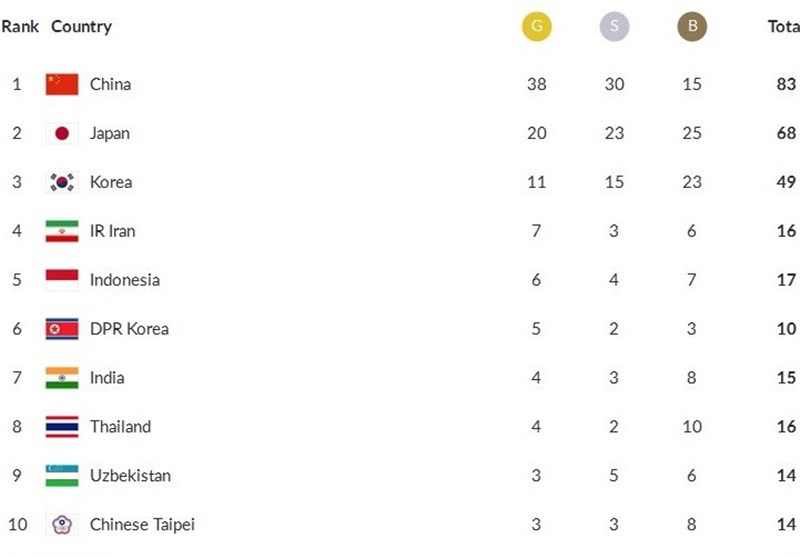 کاروان ایران با این چهار مدال، یک رتبه در جدول توزیع مدال‌ها صعود کرد و پس از چین، ژاپن و کره جنوبی و بالاتر از اندونزی در رده چهارم قرار گرفت.