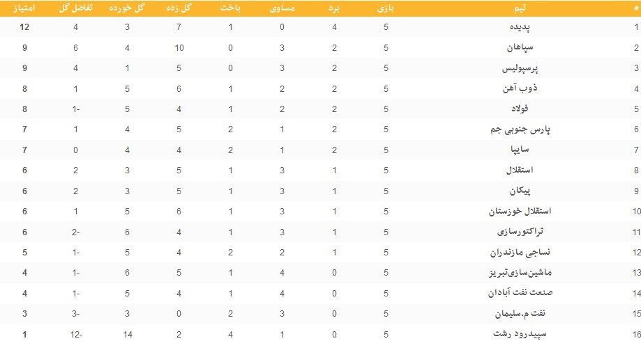نتایج کامل دیدارهای هفته پنجم لیگ برتر به شرح زیر است: