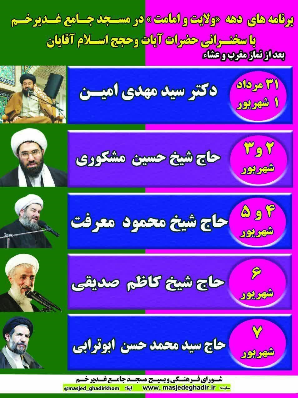 در همین راستا شنبه سوم شهریورماه بعد از نماز مغرب و عشاء حجتالاسلام حسین مشکوری در ارتباط با جایگاه والای عید غدیر و لزوم احیای آن به سخنرانی میپردازد. همچنین یکشنبه و دوشنبه چهارم و پنجم شهریورماه حجتالاسلام محمود معرفت و سه شنبه ششم شهریور حجتالاسلام کاظم صدیقی امام جمعه موقت تهران به سخنرانی میپردازد.