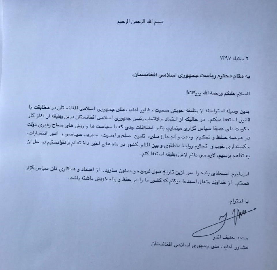 رویترز نیز بهنقل از یکی از مقامات ارشد دولتی و نزدیک به اتمر نوشت که مشاور سابق امنیت ملی در نظر دارد تا در انتخابات ریاست جمهوری 2019 نامزد شود و به همین دلیل از سمت خود استعفا داده است.