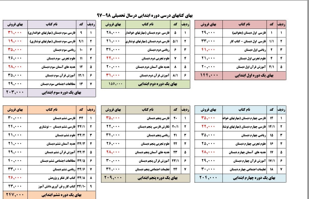قیمت کتابهای درسی دوره ابتدایی