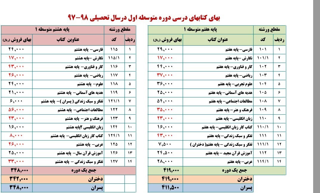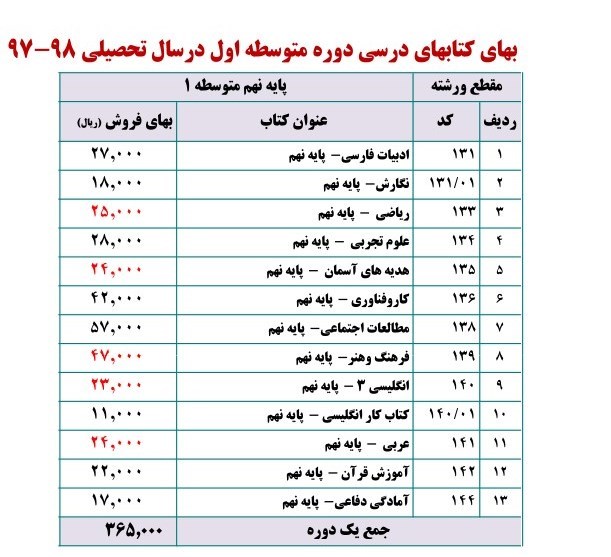 قیمت کتابهای درسی دوره متوسطه اول