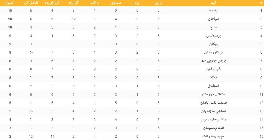 جدول لیگ برتر تا پایان شش دیدار نخست هفته ششم به شرح زیر است: