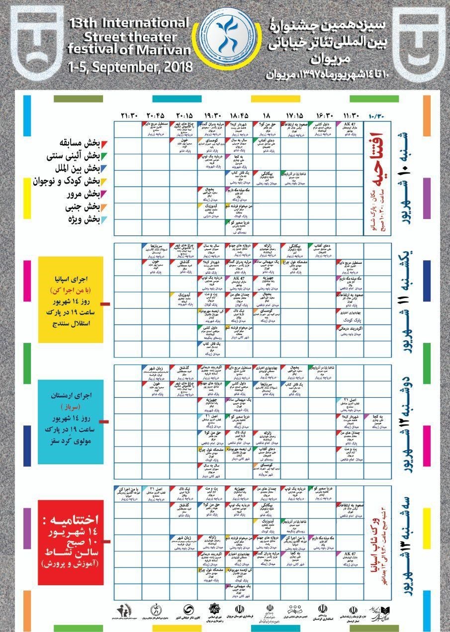 آنچه که در ادامه مشاهده میکنید، فهرست اجراهای بخش مسابقه، آیینی سنتی، بینالملل، کودک و نوجوان، مرور، جنبی و ویژه سیزدهمین جشنواره بینالمللی تئاتر خیابانی مریوان است.