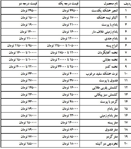 قیمت فروش 20 قلم از مجموع 98 نوع آجیل و خشکبار قابل عرضه در واحدهای دارای مجوز میادین و بازارهای تحت پوشش سازمان مدیریت میادین به شرح زیر اعلام شده است.
