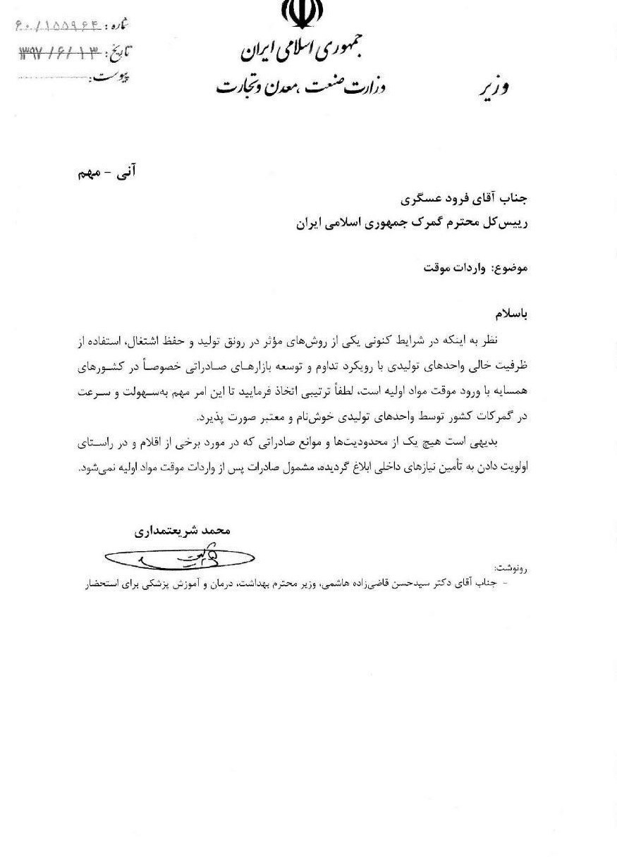 در این نامه آمده است، نظر به شرایط کنونی یکی از روشهای موثر در رونق تولید استفاده از ظرفیت خالی واحدهای تولیدی با رویکرد تداوم و توسعه بازارهای صادراتی خصوصا در کشورهای همسایه با ورود موقت مواد اولیه است لطفا ترتیبی اتخاذ نمایید تا این امر مهم به سهولت و سرعت در گمرکات کشور توسط واحدهای تولیدی و خوش نام و معتبر صورت پذیرد.