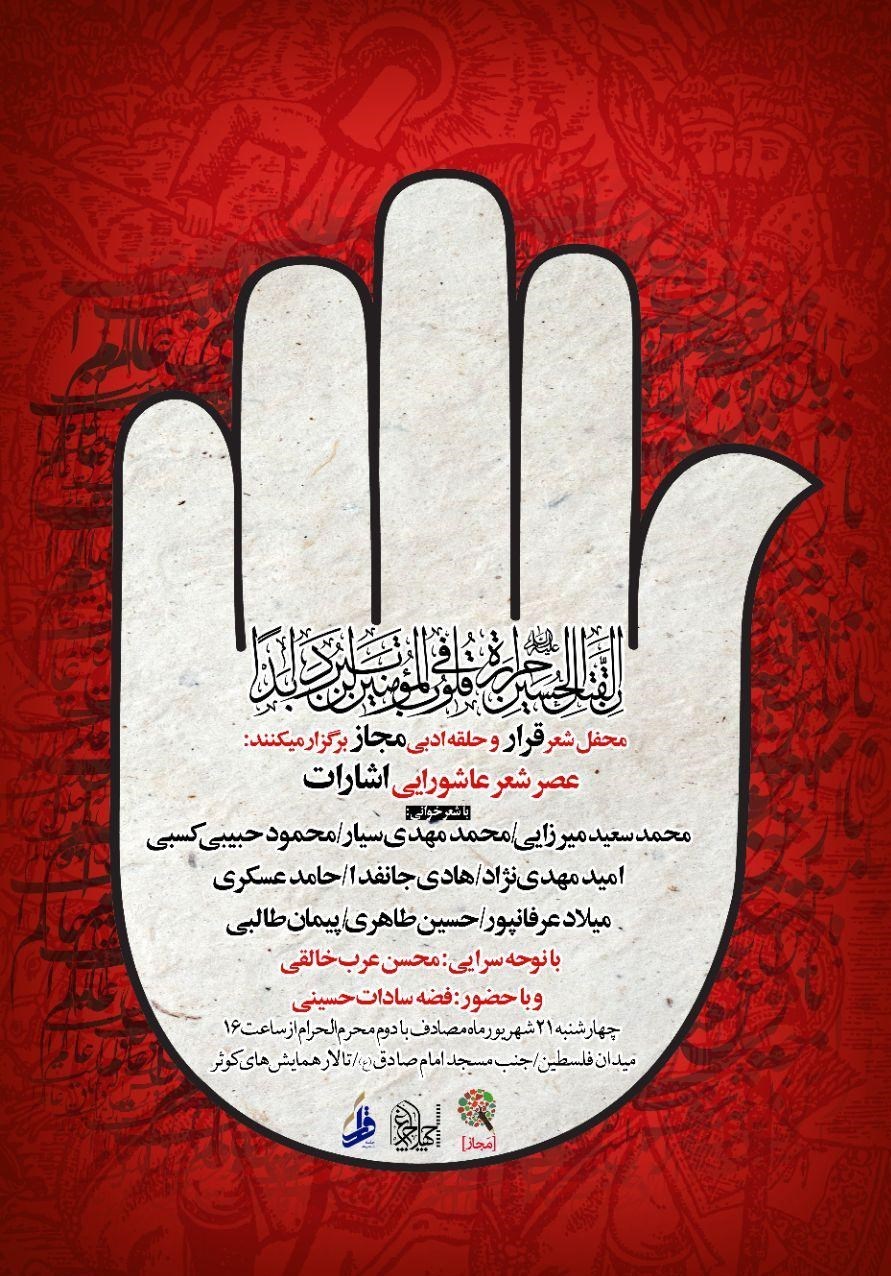 به گزارش خبرنگار فرهنگی باشگاه خبرنگاران پویا، عصر شعر عاشورایی «اشارات» بههمت محفل شعر «قرار» و حلقه ادبی «مجاز» همزمان با فرا رسیدن ایام محرم الحرام برگزار میشود.