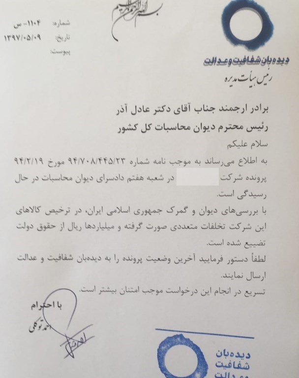 بر اساس مکاتبه احمد توکلی با عادل آذر، با بررسیهای دیوان محاسبات و گمرک، در ترخیص کالاهای این شرکت تخلفات متعدد شکل گرفته و هم اکنون پرونده تخلفات در شعبه هفتم دادسرای دیوان محاسبات در دست رسیدگی است.