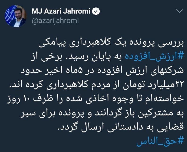 آذری جهرمی در این پیام نوشته است: بررسی پرونده یک کلاهبرداری پیامکی ارزش افزوده به پایان رسید. برخی از شرکت های ارزش افزوده در 5 ماه اخیر حدود 22 میلیارد تومان از مردم کلاهبرداری کرده اند. خواسته ام تا وجوه اخاذی شده را ظرف 10 روز به مشترکین بازگردانند و پرونده برای سیر قضایی به دادستانی ارسال گردد.