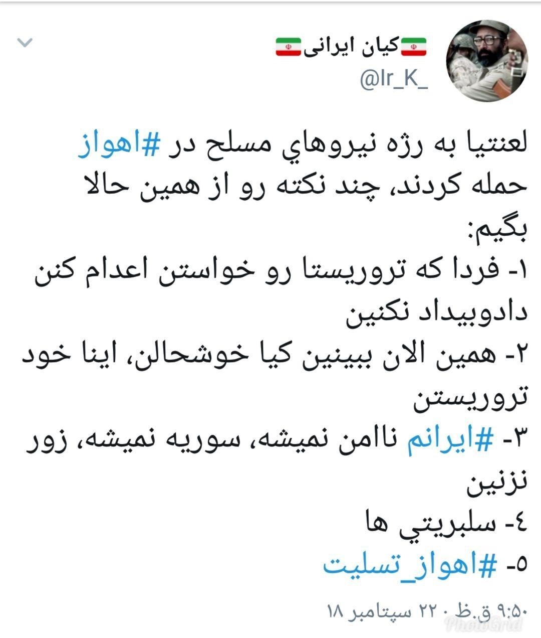 در پی حمله تروریستی به رژه اهواز کاربران ایرانی واکنش‌ گسترده‌ای را در محکومیت این حادثه تروریستی انجام دادند.