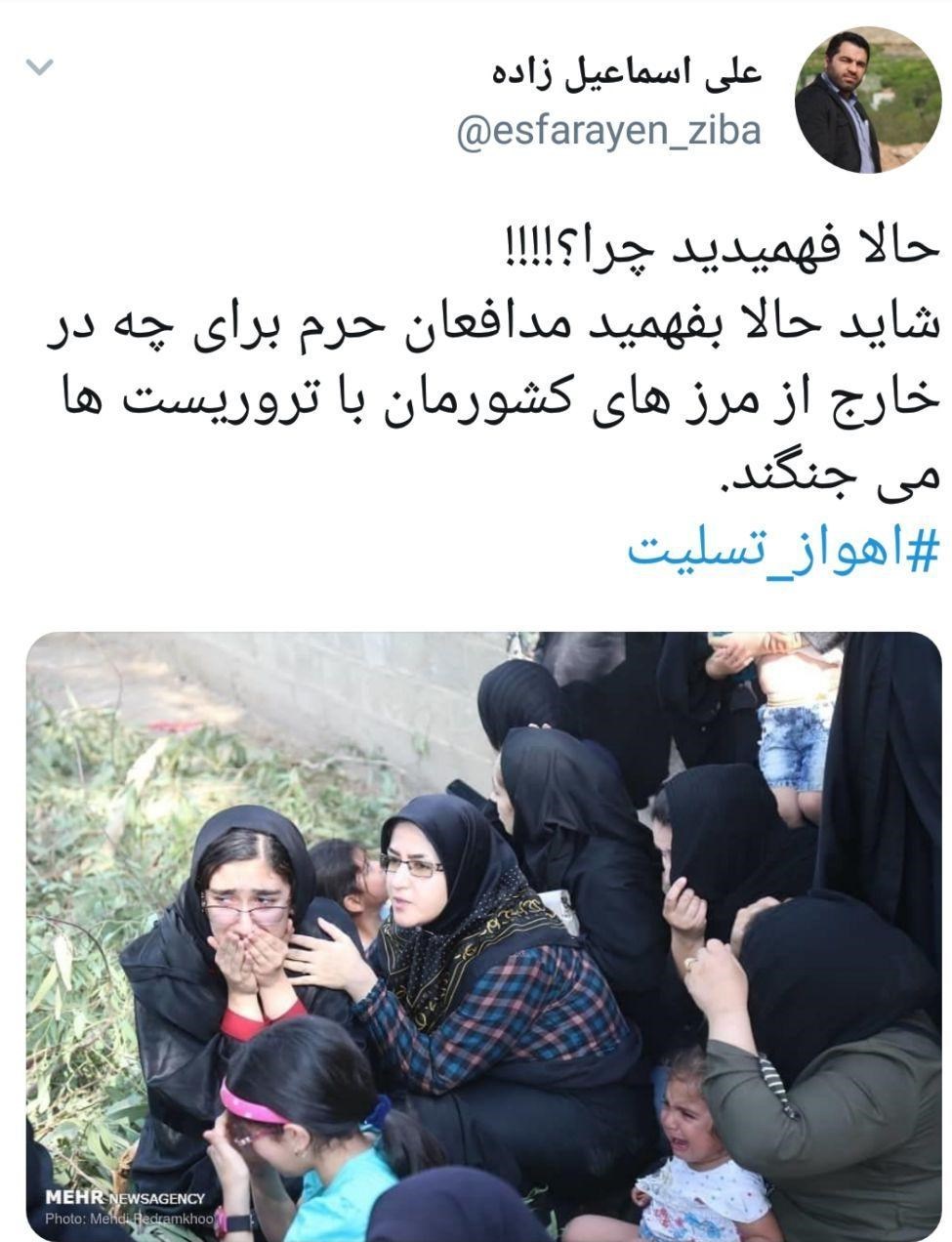 در ادامه هشتگ‌هایی نظیر #اهواز_تسلیت، #سرباز_تسلیت، #ترقه_بازی_تروریستی و.... به حوادث صبح امروز اهواز پرداخت.