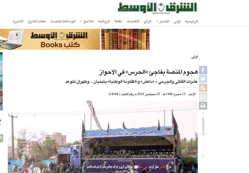 به گزارش گروه بین الملل خبرگزاری تسنیم، حمله تروریستی روز گذشته در اهواز که در جریان رژه نظامی به مناسبت هفته دفاع مقدس رخ داد، به یکی از عناوین اصلی بسیاری از روزنامه های عرب زبان از جمله روزنامه های سعودی و اماراتی تبدیل شد.