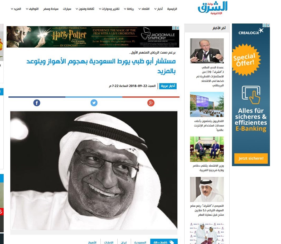-مشاور ابوظبی، عربستان را در ارتباط با حمله اهواز گرفتار کرده و به اقدامات بیشتر تهدید کرد.