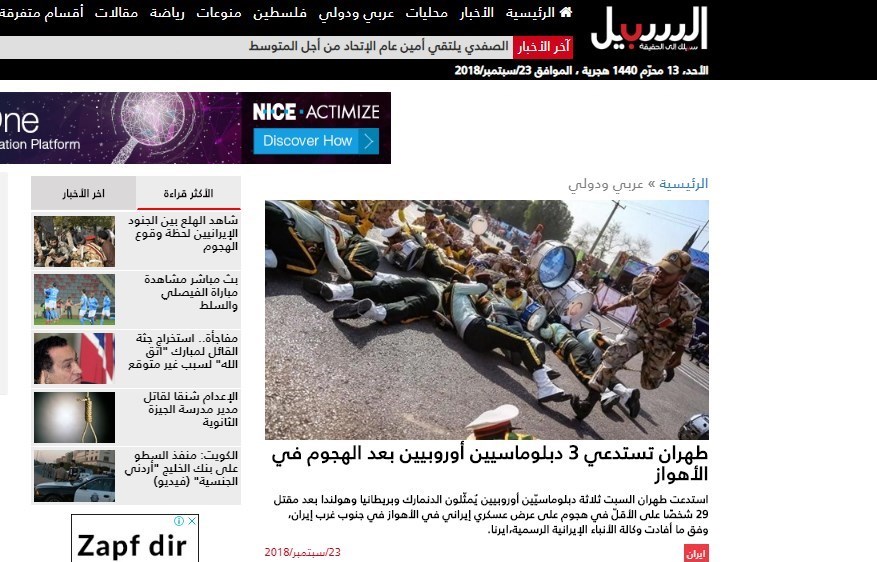 -تهران دیپلمات های سه کشور اروپایی را بعد از حمله به اهواز احضار کرد
