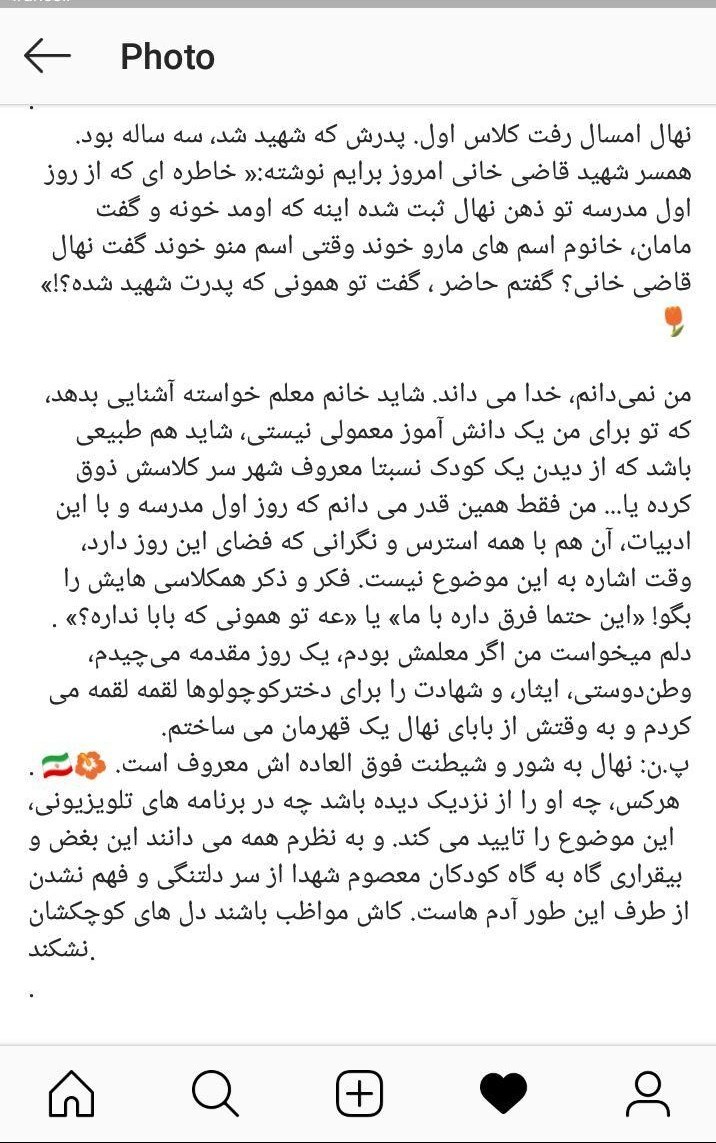 در همین رابطه یکی از کاربران شبکههای اجتماعی نوشته است:« نهال امسال رفت کلاس اول. پدرش که شهید شد، سه ساله بود. همسر شهید قاضی خانی امروز برایم نوشته:"خاطره ای که از روز اول مدرسه تو ذهن نهال ثبت شده اینه که اومد خونه و گفت مامان، خانوم اسم های مارو خوند وقتی اسم منو خوند گفت نهال قاضی خانی؟ گفتم حاضر، گفت تو همونی که پدرت شهید شده؟!"